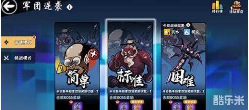 军团逆袭困难难度每日会有不同的战场效果,同时每个BOSS会有1个BOSS特性。完成普通模式困难难度后可以解锁挑战模式,挑战模式分为固定挑战和合作挑战两种玩法。