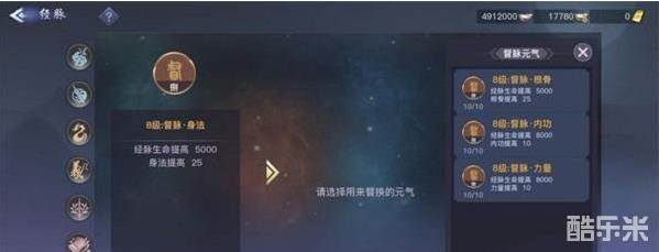 其中外功是第一属性,身法精气为第二后属性,力量增加的也是外功所以同样算在第一属性。所以经脉的元气选择就以外功力量为主,在没有这个属性元气后,再选择身法和精气。