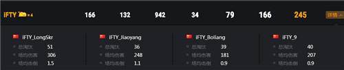 从数据上看,iFTY总淘汰数傲视群雄,他们常规赛中一共拿到了166个淘汰,比总积分排名第一的TSG战队还要多,这足以说明这对班子的手感火热。四名队员的发挥都相当抢眼,个人淘汰数均达到了35以上。其中明星选手iFTY_LongSkr最为凶狠,以51个总淘汰数位列常规赛淘汰榜第四位,保持着顶尖枪男的实力,“外星人”称号名副其实。