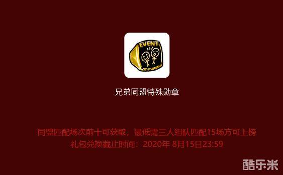 6. 活动结束后同盟匹配场次排行前十,前十将获得兄弟同盟特殊勋章,最低需一起组队匹配15场方可上榜。