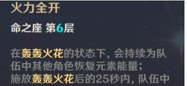 氪佬专属,相比于二测第六层的利用率更高了,且都是针对大招进行队友辅助增益,快速恢复队友能量,帮助其更快开启大招,无论是在秘境还是在深渊中,可莉的大招恢复速度并不慢,当施放轰轰火花后,不仅全队可享受到10%的火元素伤害加成,而且新更新的元素共鸣系统,当同队有两名火系角色时,全队还再将获得10%的基础攻击力加成,所以在这个时候,整体团队的战斗力是非常强的。