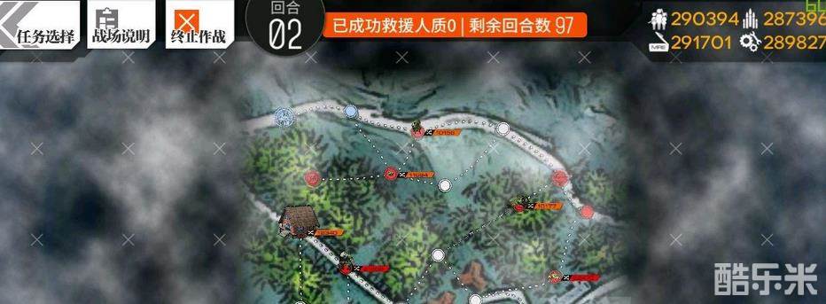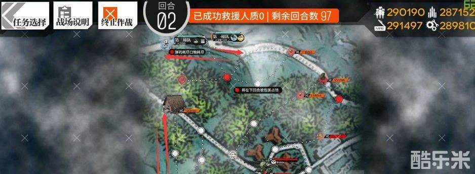 第二种情况,绿弓向后一步(如图2),此时下方RF队依然向上打掉兵工厂后原路返回,上方AR队前进打掉绿弓,等第三回合撤退两个打手即可。(不嫌麻烦可以再花点时间顺便打掉上路的小螃蟹,也有判定,但是不推荐过关打捞,要么拆叶格尔要么需要很多回合,更麻烦)