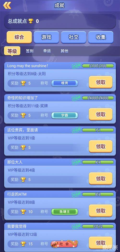 “成就任务”共分为四大类,分别是:综合、游戏、社交、收集。完成不同“成就任务”,即可收集“成就点”,部分“成就任务”还提供“称号”奖励。
