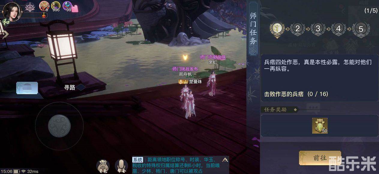 每个门派都设置了特定的NPC帮助玩家接取是门挑战任务,玩家每日可以接取一轮师门挑战任务,一轮任务共有5次讨伐杀怪的任务,完成后,可以获得师门贡献奖励。无论有没有完成,次数都会每日刷新。师门挑战都是一些击杀野怪的任务,难度不大,点击寻路后,可以自动前往怪物地点,自动打怪,非常轻松就可以完成。