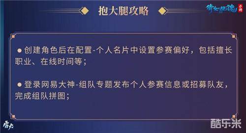 同时,玩家在创建角色后可以在个人名片中设置参赛偏好,包括擅长职业、在线时间等信息,或在网易大神组队专题上发布个人参赛信息进行队友招募,与志趣相投的玩家共同组队增加获胜几率。