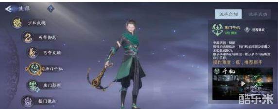 千机为远程爆发职业,使用弩箭。优点是技能伤害高,机动性高,灵活,独门暗器加上淬毒之术让这个流派攻击能力强大。此外千机流派所有技能都是无消耗,只受冷却时间的限制。千机操作难度低,非常适合萌新玩家。