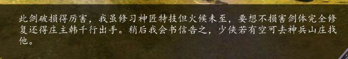 以上就是下一站江湖神兵山庄攻略,大家如果已经获得了破剑那就抓紧去触发任务获得名器吧,希望大按键在游戏中玩的开心。
