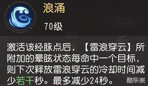 2.浪涌(和海中蛟虬经脉下一致):"雷浪穿云"所附加的晕眩状态每命中一个目标,则下次释放雷浪穿云的冷却时间减少若干秒,最多减少24秒。具体增益,冷却时间减少:3/4.5/6秒。