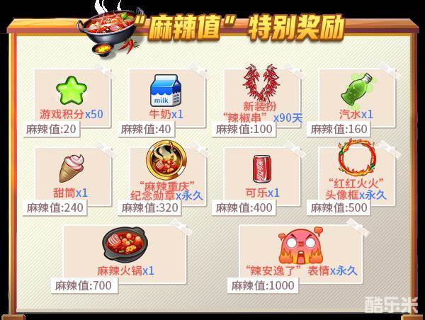 根据您在活动期间获得的“麻辣值”,可解锁特别奖励。当“麻辣值”达到1000后,每额外获得300麻辣值,可领取一份非绑定“麻辣火锅”!