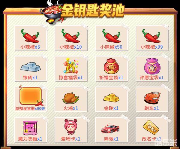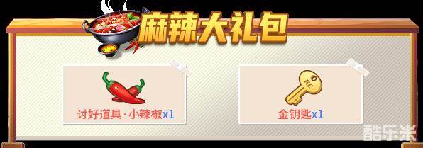 活动期间,“麻辣大礼包”限时出售,售价200金币,内含“讨好道具:小辣椒”和“金钥匙”各一份!接收“小辣椒”可兑换特别奖品,使用“金钥匙”可参与活动抽奖!