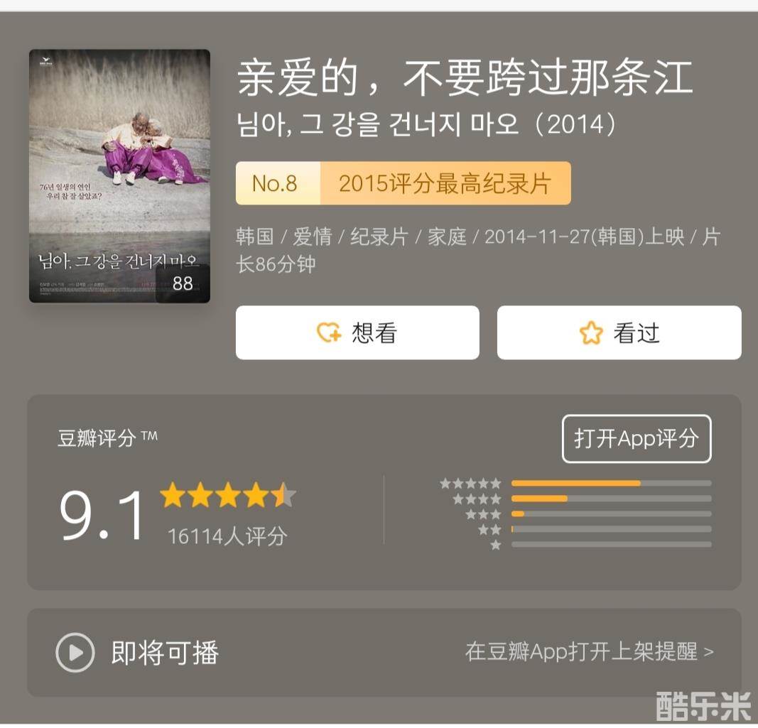 1.记录片《亲爱的别跨过那条江》韩国豆瓣评分9.1分