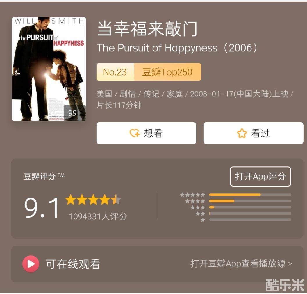8.电影《当幸福来敲门》豆瓣评分9.1分美国剧情片