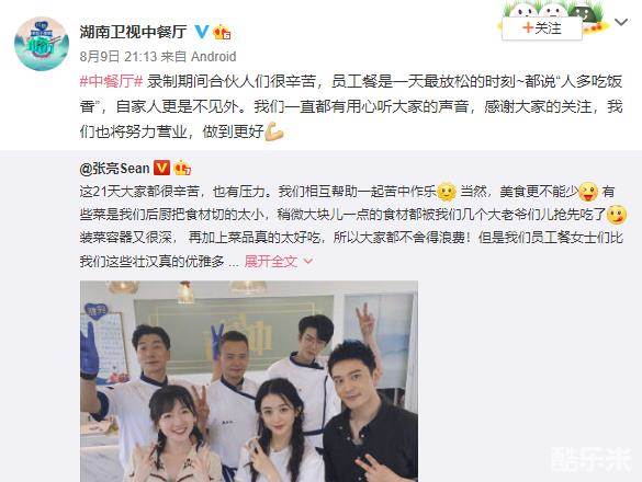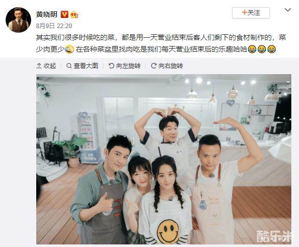 晚上的时候黄晓明也在微博里说到:“其实我们很多时候吃的菜,都是用一天营业结束后客人们剩下的食材制作的,菜少肉更少。在各种菜盆里找肉吃是我们每天营业结束后的乐趣”晓明哥的话则更加让大家觉得节目的辛苦以及真实性,因为不浪费食材所以用剩下的食物做成大家的晚饭,这样一来菜量自然就少,菜少了自然就不好夹翻来翻去也是正常的现象了,晓明哥的话语很幽默能看出他不想让《中餐厅》这个原本是治愈快乐的节目成为一个给人更多不愉快的节目,想让大家开心一些~