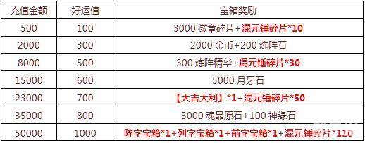 【活动内容】活动期间可通过充值金币获得好运值,积累好运值即可打开宝箱奖励,闪耀称号,全新神器,绝对超值的提升战力资源,尽在特惠好礼。