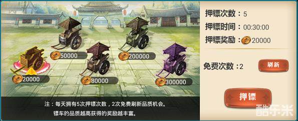 龙门镖局位于游戏内【奇遇】副本中,可以从中获取大量铜币资源。当领导力等级达到11级时开启,每日押镖次数限制为5次。初始镖银奖励为10000铜币,玩家可以通过消耗少量元宝刷新至200000铜币奖励档次。当玩家VIP等级达到6级时,可使用快马加鞭功能,跳过押镖时间。每日完成3次押镖任务,可在日常任务出领取奖励。