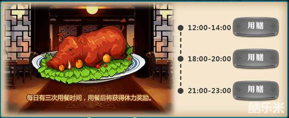 御膳房位于游戏内【奇遇】副本中,可以通过御膳房用餐每日额外免费领取体力。当领导力等级达到7级时开启,每日用餐时间为12:00—14:00,18:00—20:00,21:00—23:00,依次获取体力数值为:20,10,10,每日用餐两次,可在日常内领取任务完成奖励。