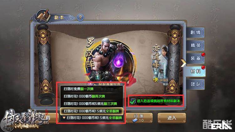 好吧,土豪大大说可以扫荡呀~但是!扫荡券多珍贵大家都懂的,况且还不能把牌子全部翻完,感觉很亏有木有!现在不用担心啦,最近一次更新后,游戏中新添了“进入后连续挑战所有材料副本”可以勾选,同时,还可以选择挂机中当个副本结束后,翻几次牌子!只要提前设置好,基本上10分钟后回来就全部自动搞定,大把材料乖乖躺在背包里啦~动动手指,so easy!