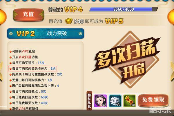 所以多购买体力可以更快的提升等级,但是购买次数是有限制的,和VIP等级相关,具体可查看VIP等级特权介绍。