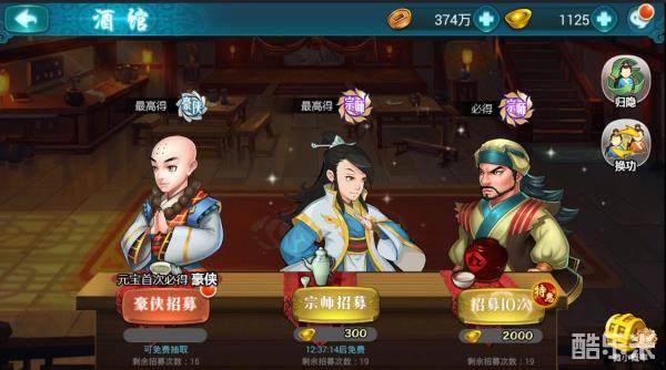 各位大侠打开游戏主界面,点击“酒馆”按钮,进入酒馆界面,在酒馆的右上方就有一个“换功”按钮,点击进去就是我们今天要介绍的换功啦!