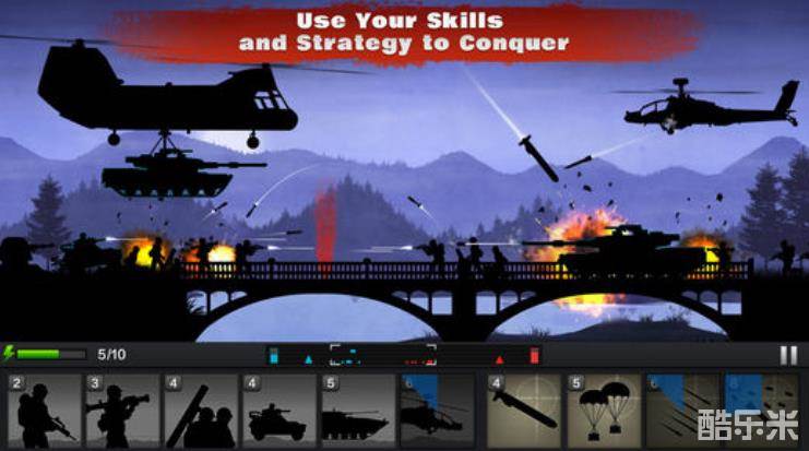 带领你的军队体验夕阳西下或是黎明破晓等不同的10个战斗场景,结合2D剪影效果和特效蒙版的处理,以黑色幽默展现真实战场。全程紧张刺激的配乐和音效,流畅的爆炸射击动画效果,让你切身感受到作为战地指挥官的神圣使命感;