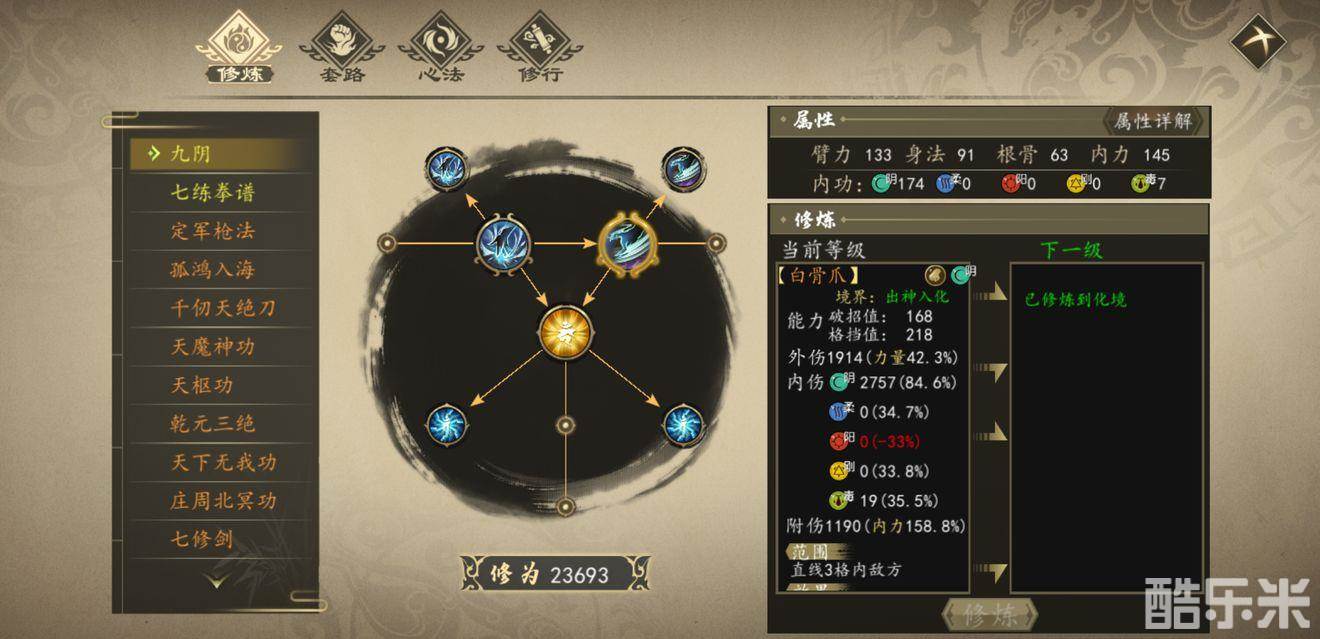 武学与心法:游戏中套路与心法分为,阴、柔、阳、刚、毒五类。