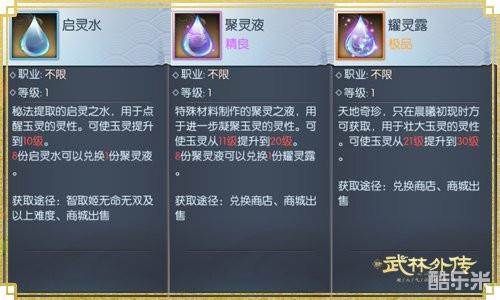 江湖中,天地灵气凝结幻化出的启灵之水,可用于提升玉灵等级。以日月精华贯穿武者躯体,激活隐藏潜能,助其实力飞升。启灵水可通过无双以上难度的“智取姬无命”副本获得,随培养次数递增,要兑换更高级别的启灵物品才可继续升级。