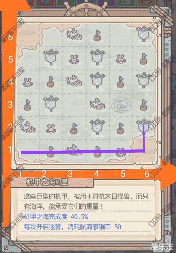 (6,2)处为守关精英怪和平使者,击败后激活(5,3)处漩涡,可以进入下一层海域。