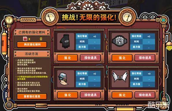 玩家点击强化按钮,会通过消耗燃料强化该道具,不同强化等级消耗染料不同。强化成功提升强化等级时,根据强化等级可以获得对应的使用时间或者道具能力值。+10等级的道具会变为特效/动作道具。