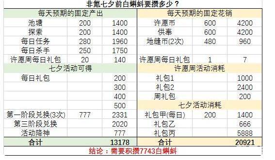 表格中少了一些白蝌蚪来源和一些支出,由于非氪玩家可能不会考虑这些内容所以没有计算,大家可以按照自己的实际情况加入。