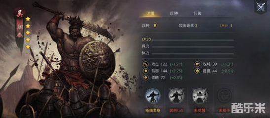 周泰,自带被动战法疮痍累身—战斗开始后,使自身受到的所有伤害降低84%,每当受到攻击或策略攻击的伤害后,对此类型伤害的减伤效果将降低1/12,位于前锋及中军时前2回合援护友军全体;同时每次受到伤害后有50%几率使攻击属性、防御属性、谋略属性提高20,该效果可叠加,持续直到战斗结束。