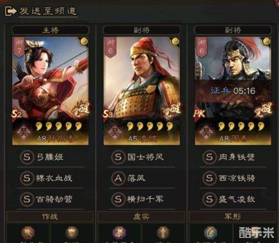 孙尚香裸衣必带,另一个技能想稳妥点就虎踞,战场上横着走;想暴力点就百骑。用一骑和暴戾的话建议上虎豹骑,凌统换太史慈,周泰必带铁骑驱驰,那就是另一套玩法了。