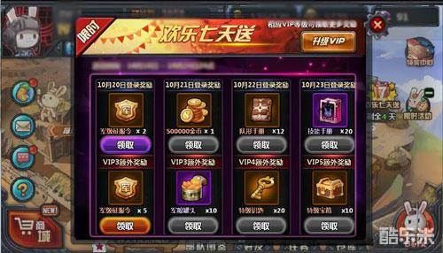为了回馈游戏玩家的每天登陆,此次活动开启了“欢乐七天送”。每一天的奖励都是你升级中必不可少的资源。10月22日至10月28日期间,只要你连续七天登录游戏,这里就有你想要的金币、手册和钻石,统统免费拿走。游戏VIP玩家根据等级更是可以获得额外的奖励,终极研究卡、特级宝箱、军级征服令等超稀有道具倾情奉上,精彩不容错过!