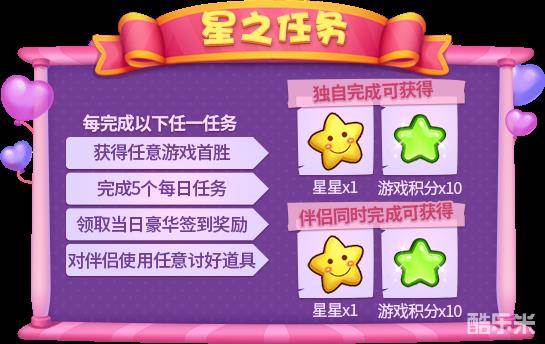 活动期间,当您独自完成一个任务后可立即领取一颗“星星”和游戏积分,如果您和伴侣在当天都完成了同一个任务,您可以再次领取该奖励!累积星星,向更丰厚的礼物出发吧!