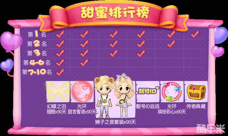 活动期间,每消费1金币获得即可获得1恩爱值!玩家拥有的恩爱值越高,位于“甜蜜排行榜”的名次越高!活动结束后,根据您的排名,抱走奖励吧!