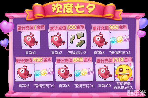活动期间,累计充值金额达到相应条件,即可领取“喜鹊”、全新互动表情等丰厚奖励!并且,根据全服玩家累计领取“喜鹊”的数量,开放“全民热恋”奖励领取!