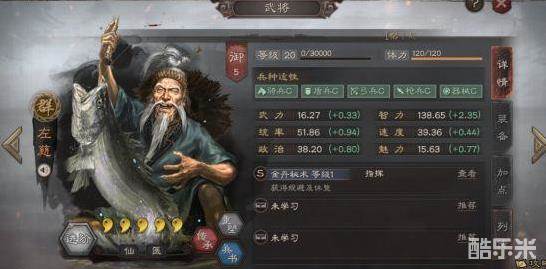 左慈是5御英雄,主智力,诸兵种适性全都是C,缺乏正面领兵作战的能力,主要作为辅助身份登场。