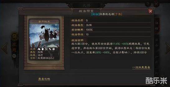 准备一回合,对敌方群体发动谋略攻击,并且回复我方群体的兵力。十分万金油的战法,补足队伍伤害的同时,进一步强化武将的恢复能力,从而使得队伍整体能够获得高度持续作战的能力。