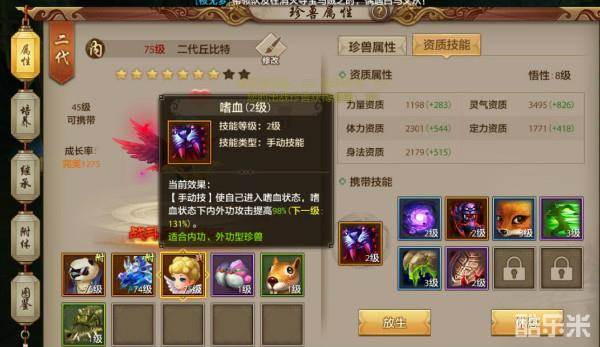 关于技能的选择,手动技能有两个选项。首先就是现在非常火热嗜血技能。可以大幅度提升珍兽的内外功攻击,持续一段时间。这个技能,在PVP和PVE的活动中都有不错的效果。建议攻击型珍兽的手动技能首选。