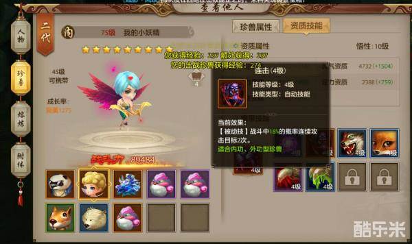目前版本中的神级珍兽技能,被动增加珍兽的命中,闪避,会心属性,一个技能增加了3个被动属性,是攻击型珍兽必学的技能。下面就是连击技能,攻击型珍兽最好的攻击技能,概率释放,连续攻击多次。