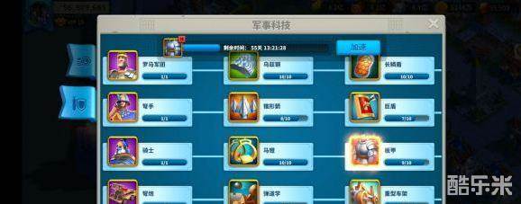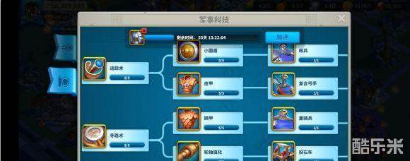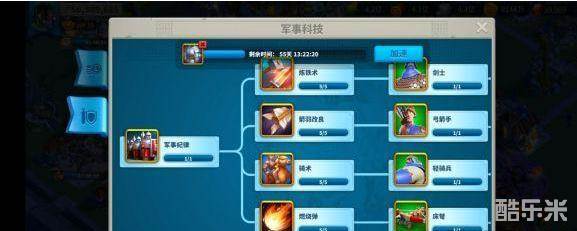 中期科技:这里的科技就是T4兵种研究的前置科技,当然他们不用需要全部研究满就可以研究T4了。但是因为中间三项科技都是十等级,所以需要很长时间,这三项的等级十部分每项拿到符文按满帮助都需要一百天左右,我们称之为小三元,等级十部分的研究一般等到中后期进行。