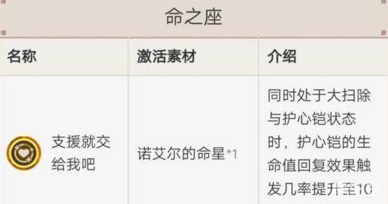 2.诺艾尔的元素战技开启期间,诺艾尔的攻击有一定的概率触发玩家自身队伍全体回血的效果(概率这种东西……你们懂的),回血量和诺艾尔的防御力相关。在第一个命之座开启后,同时处于元素战技与大招状态下的攻击必然触发回血效果。所以第一个命之座对于诺艾尔来说尤为重要,直接决定着她能不能担当奶妈的职位。