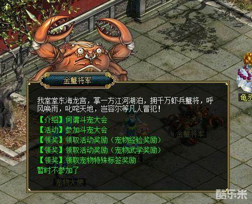 当龙宫献艺举办了一段时间,龙王又开始不满足于纯修道者的比拼,又命令金蟹将军到天墉城来举办斗宠大会。顾名思义,斗宠大会就是宠物PK平台,是同服的玩家可以相互切磋宠物战力的玩法。各位道友如果身怀天下奇宠,就可以前往天墉城金蟹将军处点击参与吧!