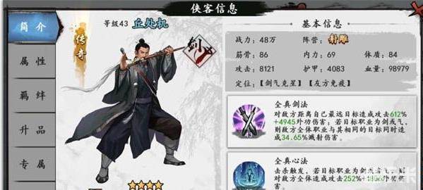 全真剑法:对距离最远的单体角色造伤,这个技能就比较考究了,首先是对最远单体,所以这个大招的目标就只能是3号位和五号位,但是这个游戏的一键布阵是按战力轮流排位的,所以个人建议是把丘道长放到5号位。然后是这个技能的特效,如果命中剑和气的目标就造成群伤(同样很低。)所以大部分情况下可以忽略不计,把他当作一个平常的对单体技能就行。