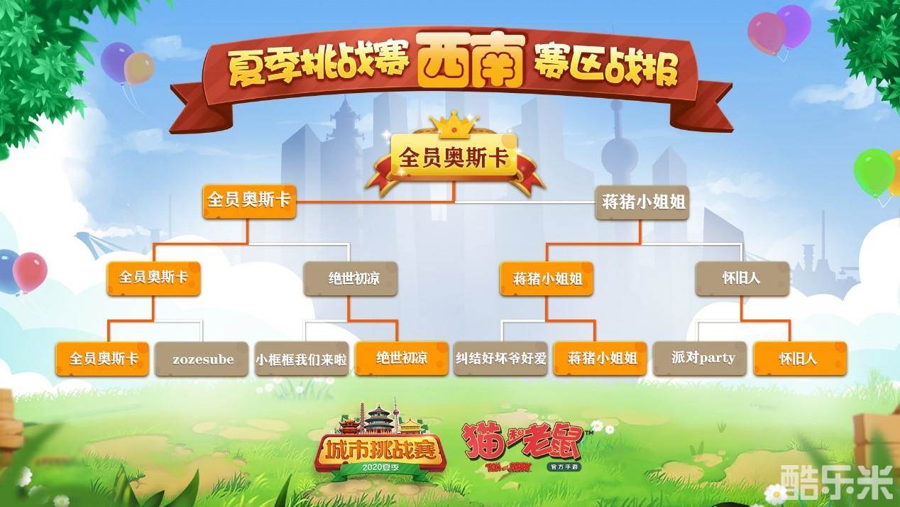 西南赛区共有32支队伍参与了海选赛,在经过激烈的角逐之后,由全员奥斯卡斩获冠军,亚军、季军分别为蒋猪小姐姐和怀旧人。