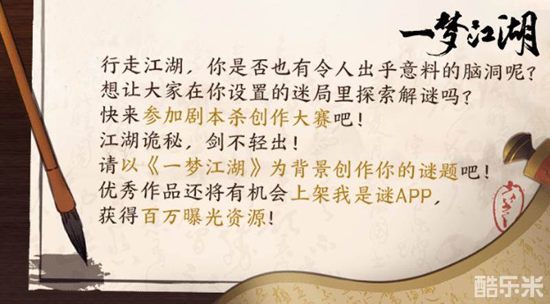 《一梦江湖》X我是谜剧本杀征集活动已经正式开启啦,参与活动就有机会获得丰厚奖励以及百万曝光机会!少侠还在等什么?快拿起手中的纸笔,创作你的玲珑谜局吧!