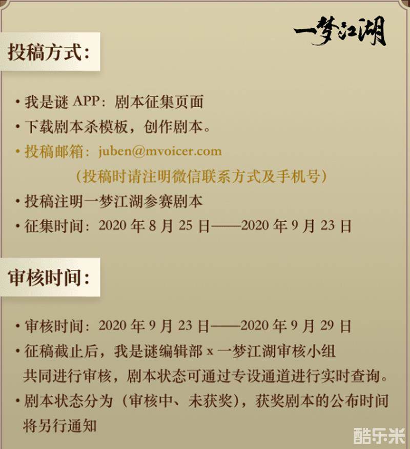 想要参与剧本杀征集活动的少侠,可以前往我是谜APP的剧本征集页面上传作品。也可以将作品发送至投稿邮箱:juben@mvoicer.com,并注明一梦江湖参赛剧本即可参赛。无论以哪种方式参赛,少侠都需要注明微信联系方式及手机号哦!本次活动征稿时间为2020年8月25日到2020年9月23日,感兴趣的少侠不要错过时间啦~