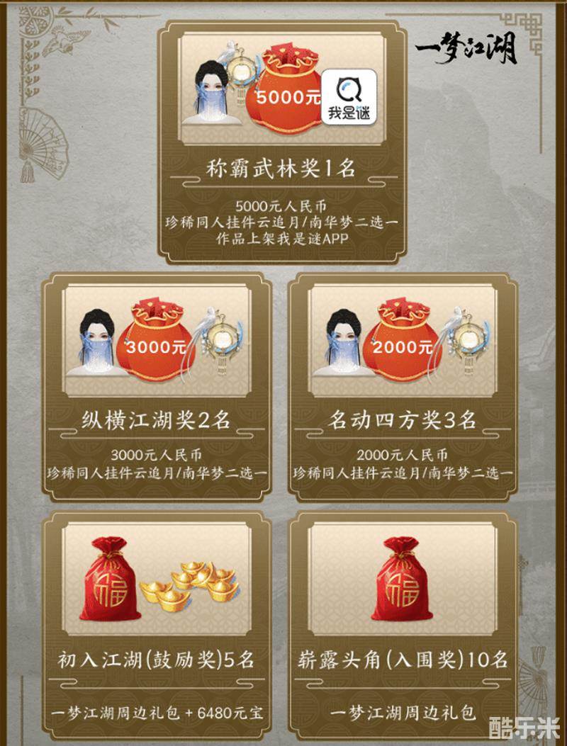 在本次剧本杀征集活动中,少侠不仅可以创作自己精彩的剧本,还有机会赢得超多奖励哦!一梦江湖与我是谜APP共同为大家准备了丰厚的大奖。奖品中不仅包括精美周边礼包,珍稀同人挂件,还有丰厚的现金奖励!只要你的剧本逻辑缜密、有亮点有创意,就有机会获得这些奖品!如果少侠的剧本获得大家的一致认可,还有机会上线我是谜APP,获得百万曝光资源!心动了吗?那就快来释放你的才华吧!