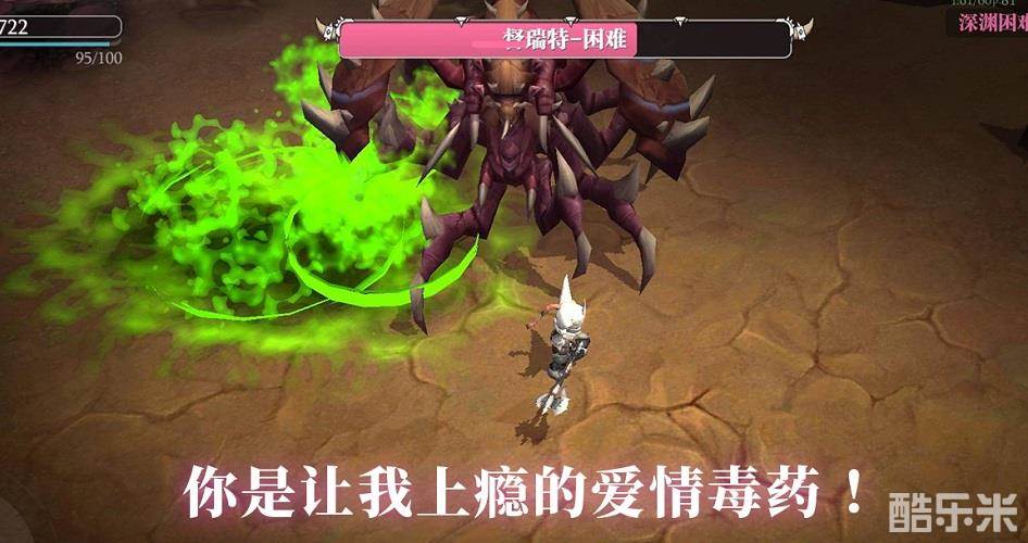 第10层的Boss督瑞特,向玩家表白“你是让我上瘾的爱情毒药”。然而实际上,这位Boss特别喜欢向玩家喷毒,它会从背后的分泌腺产生毒液,朝着玩家所在坐标喷出毒液数发,毒液落地时会造成范围性减速和持续中毒扣血的效果。