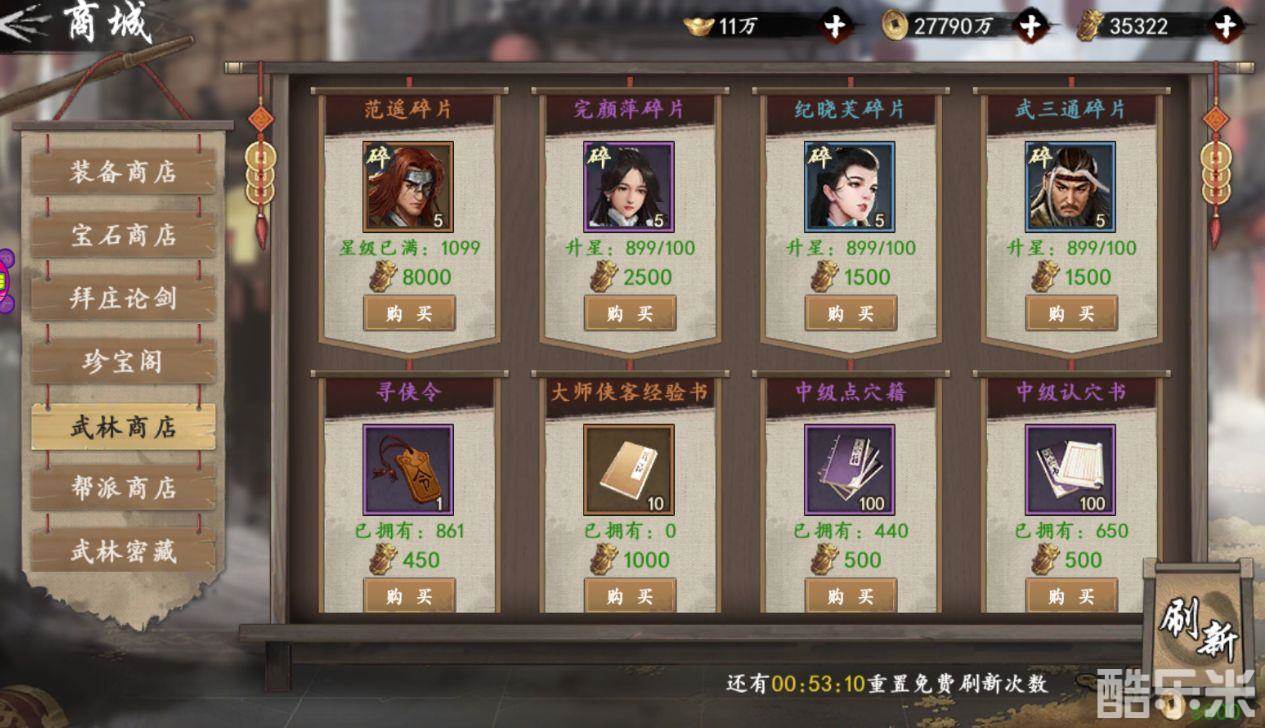在武林商城中,每8000点功勋即可换取5枚史诗级侠客碎片,帮助玩家快速养成范遥与金毛狮王这两位前期主力侠客,大幅加快新手玩家推本的速度。