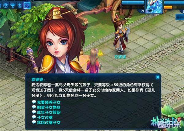而达到55级的单身玩家也可以通过领养来获得子女,可使用“观音送子图”在稳婆婆处进行领养,5天后即可获得子女,或者使用“孤儿名册”立即在稳婆婆处获得子女。